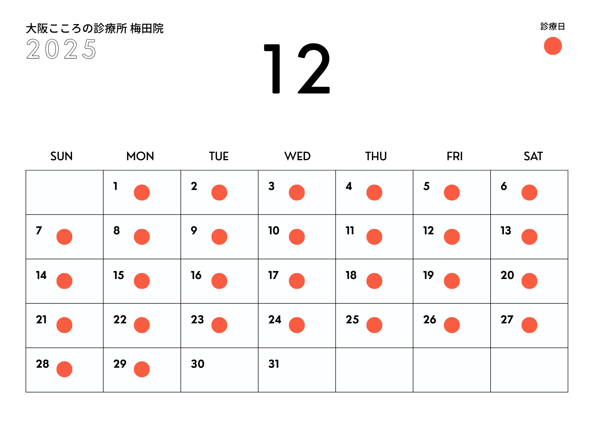 平素より当院をご愛顧いただき、誠にありがとうございます。 2025年12月の診療日について、ご案内申し上げます。 ■診療時間 10:00~14:00、15:30~20:00 ■休診日 12月30日(火)、12月31日(水) ■診療日 上記休診日を除く、月曜日から日曜日まで、休まず通常通り診療いたします。 休診日をご確認の上、お間違えのないようご来院ください。 どうぞよろしくお願いいたします。 24時間受付中 WEB予約
