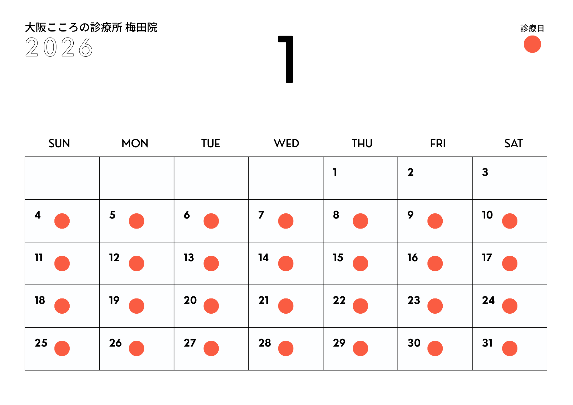 平素より当院をご愛顧いただき、誠にありがとうございます。 2026年1月の診療日について、ご案内申し上げます。 ←2025年12月の診療日はこちら ■診療時間 10:00~14:00、15:30~20:00 ■休診日 1月1日(木)、1月2日(金)、1月3日(土) ■診療日 上記休診日を除く、月曜日から日曜日まで、休まず通常通り診療いたします。 休診日をご確認の上、お間違えのないようご来院ください。 どうぞよろしくお願いいたします。 24時間受付中 WEB予約